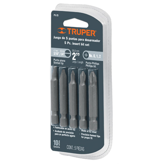 Juego de puntas combinadas, fabricadas en acero S2 (2x más resistente al desgaste que las de acero al cromo vanadio). Maquinado para un ajuste preciso y estuche reutilizable. Paso: 1/4".